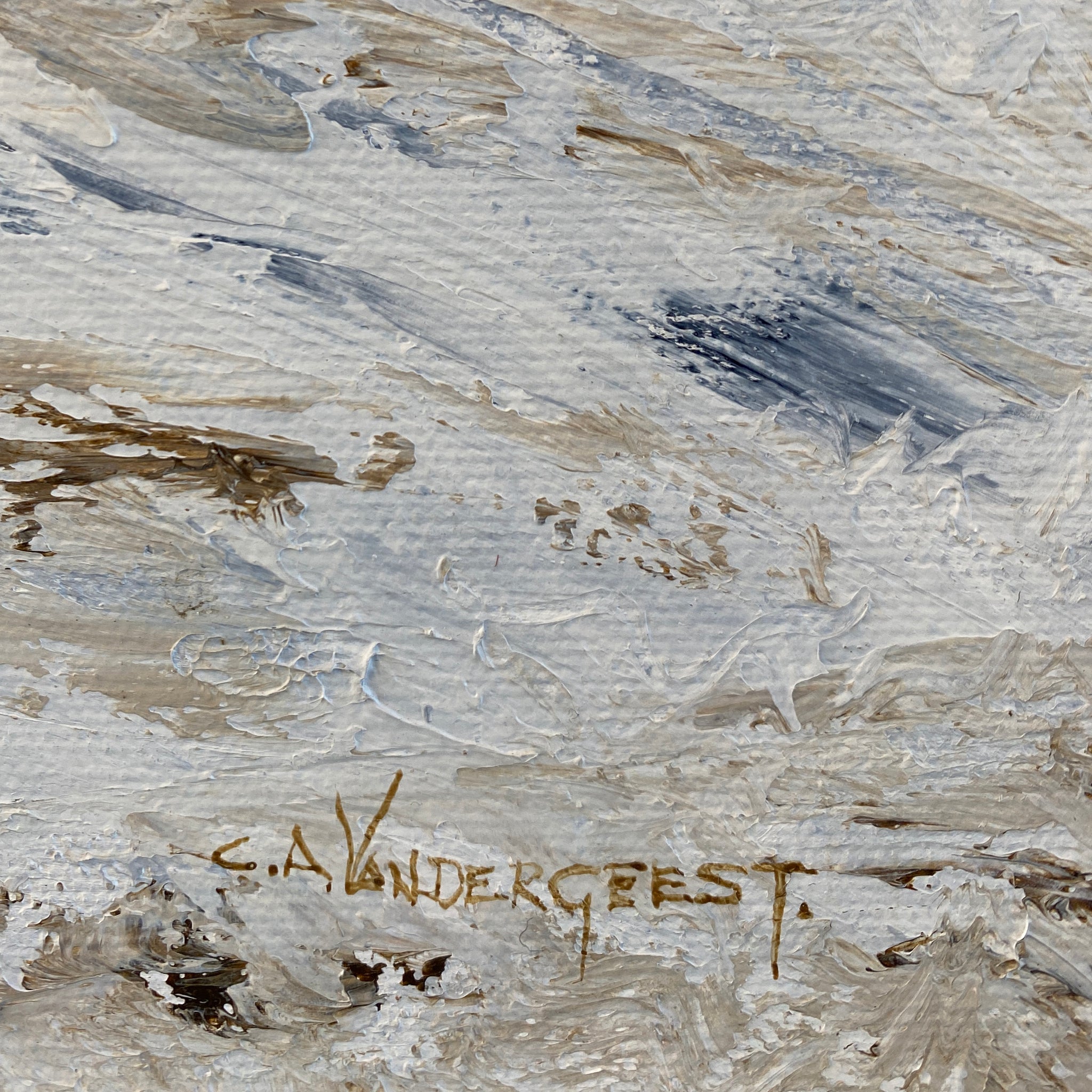 The large work is painted by artist Clarence Andrew Vandergeest (1939-2014). Vandergeest died in Ormstown, Quebec, at the age of 75. Born in Jakarta, Indonesia, he was an internationally recognized artist. His works included sculptures, monoliths and paintings.